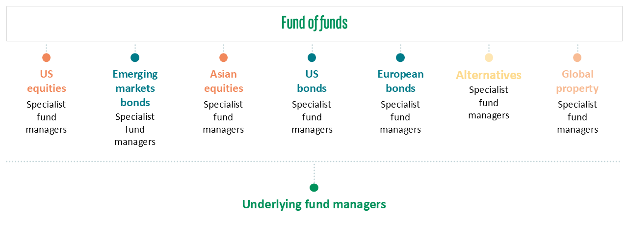 Our multi-manager funds are different; instead of focusing on just one type of investment, they invest in lots of other single-focus funds – we call these underlying funds. Every underlying fund we select is run by a specialist fund manager who knows the market inside out.