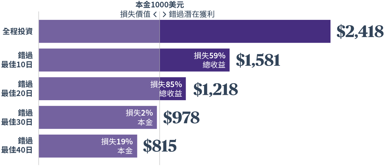 當市場波動,投資者可能傾向作出反應及轉移資金,但需要緊記市場波動司空見慣。股市經常表現波動,但長遠而言,市場普遍會趨向上行。在市場調整後撤出資金,僅等於鎖定虧損。如圖所示,這可能意味著錯過任何潛在市場反彈,而回顧歷史,股市表現最佳的日子往往在是極端波動時期發生。俗話說「留在市場投資的時間比掌握市場時機更重要」,作為長期投資者,我們認為這是正確觀念。